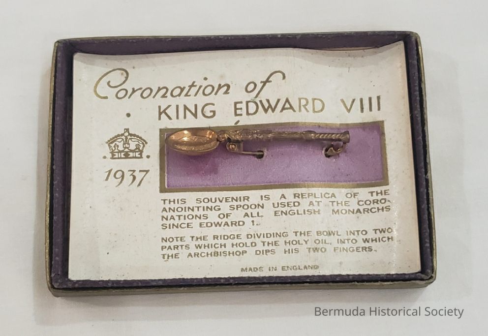 Souvenir spoon brooch replicating the anointing spoon used at the coronation of all English monarchs since Edward I. In original box.General Notes