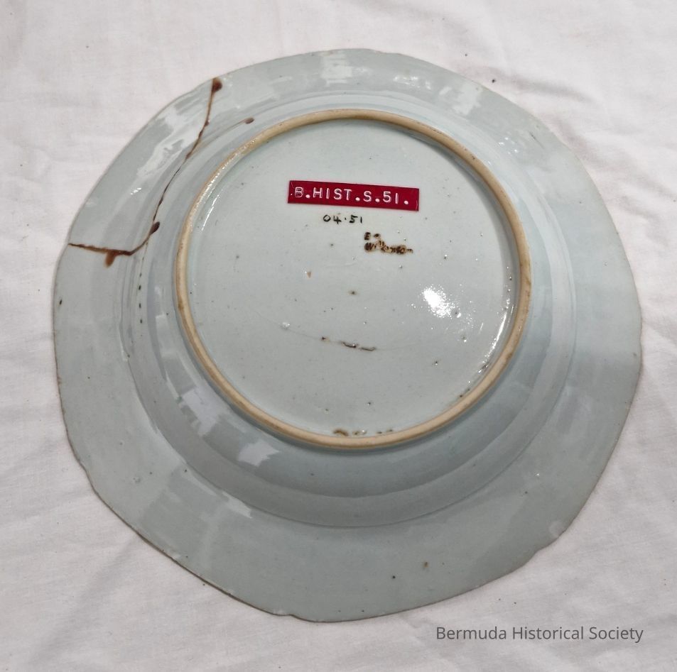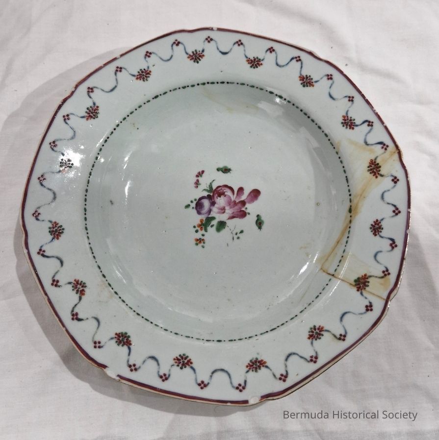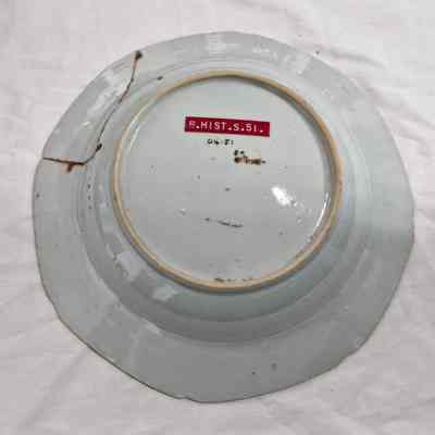 1992.04.107 Soup plate. Early, circa 1790. Chinese export porcelain. B. Hist. S. 51. From Dr. E C Wilkinson. Has hairline crack and several chips to lip and foot rim.