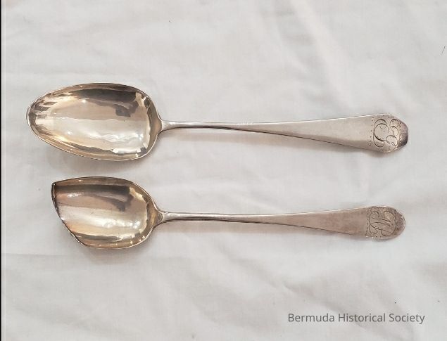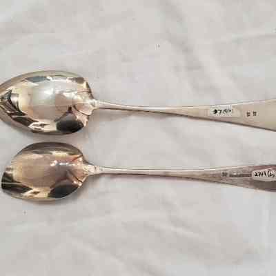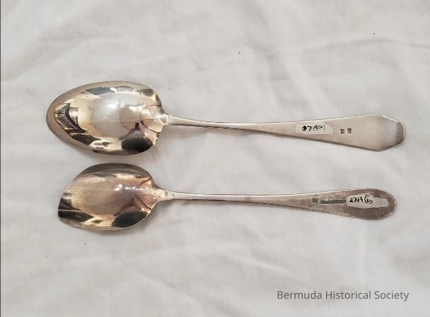 1992.27.14b 2 serving spoons, 27.19 a & b (one with diagonal spoon). BHS 91. Last valued collectively by Colin Cooke at $2,000.