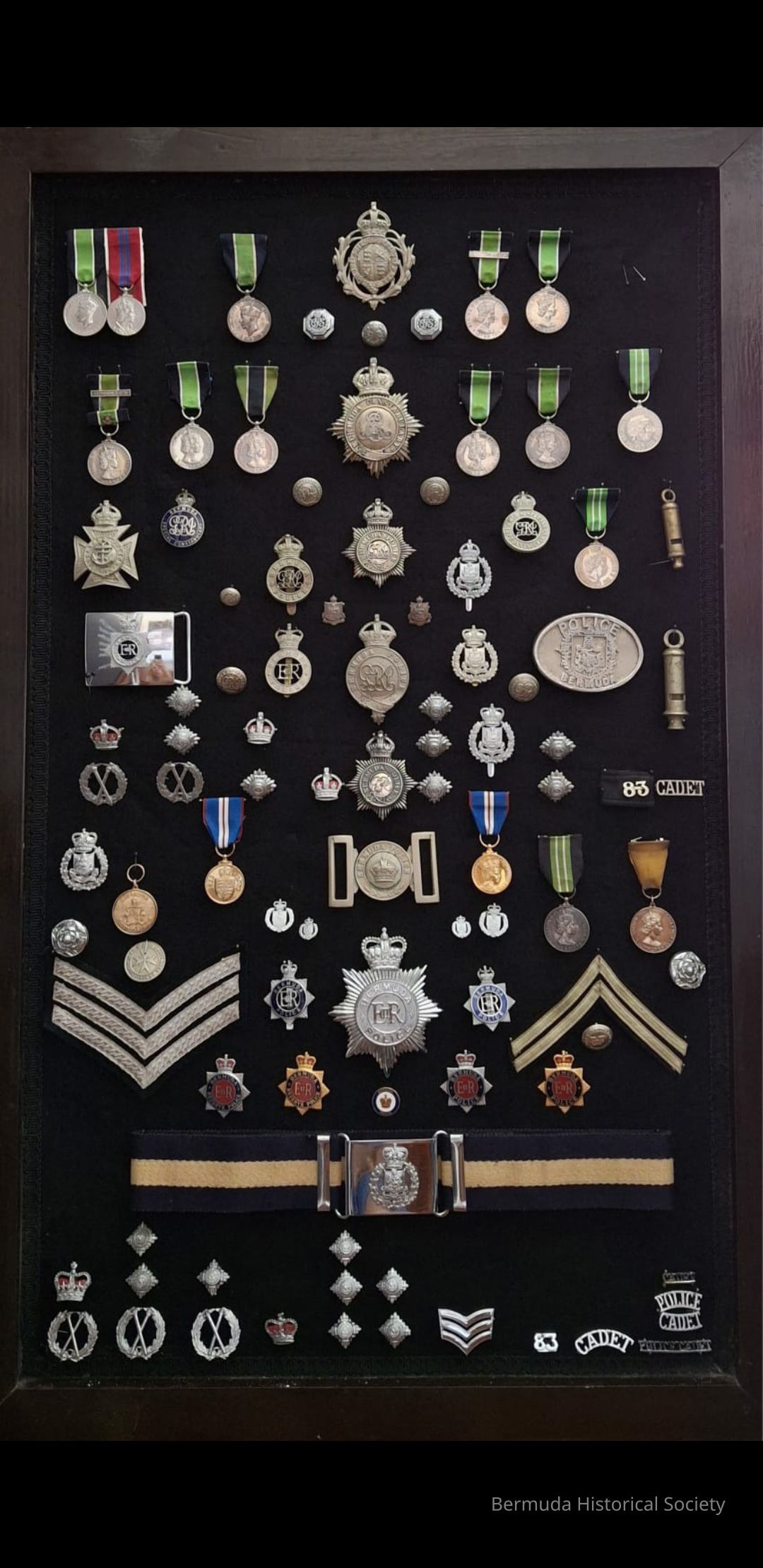 Framed collection of Bermuda Police Insignia, Badges, Belt Buckles, and Medals awarded to members of the Bermuda Police Service.Cataloged By