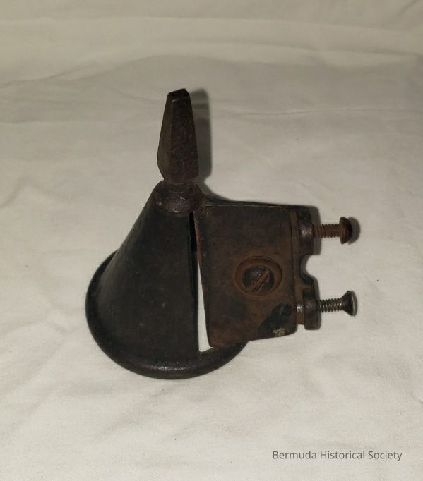Metal - similar but larger than a pencil sharpener, was used on Hawkins Island. The word 'Hawkins' inscribed near the screws.