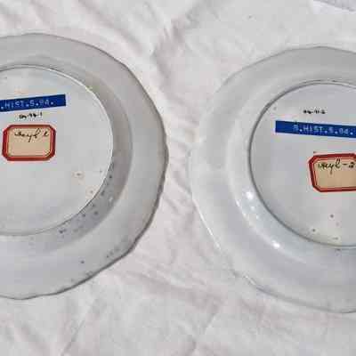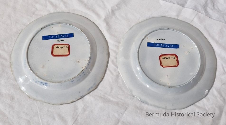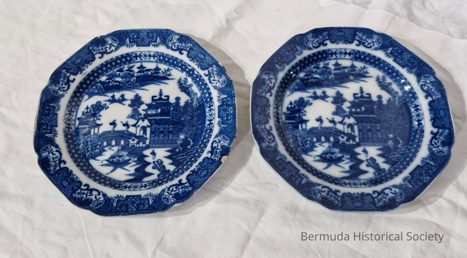 1992.04.16a and 1992.04.16b Breakfast plates. Two. Navy blue colouring. Light weight. Both listed as B. Hist. S. 94 (part). From Miss Julia Heyl. English Willow Ware, 04.94.1 has several chips around the edges