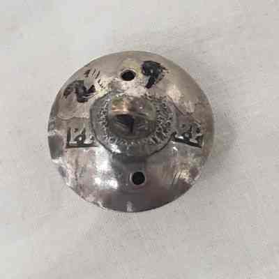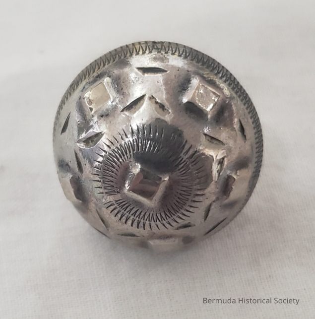 1992.27.08 1 silver button, 27.9, approximately 0.85" diameter, with PP mark and a period between as a variation from the chatelaine mark. This item is described and shown on page 172 (item 395) of "Bermuda's Antique Furniture & Silver" by Bryden Bordley Hyde and donated by the late Major Ian C. Morgan, of Montreal, PQ, Canada.