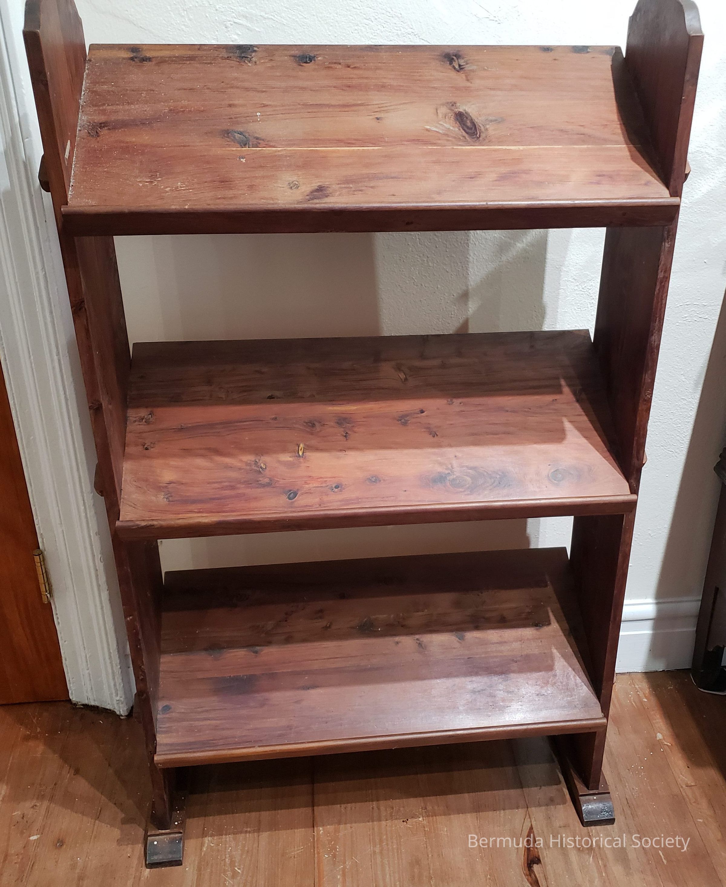CEDAR BOOK RACK (MODERN), self-standing. With three sloping, blocked-at-one-end (to hold books) shelves. 42"H x 26"W x 8"D. B. Hist. S. 45. Presently used as display case for sale of books, in living room.
