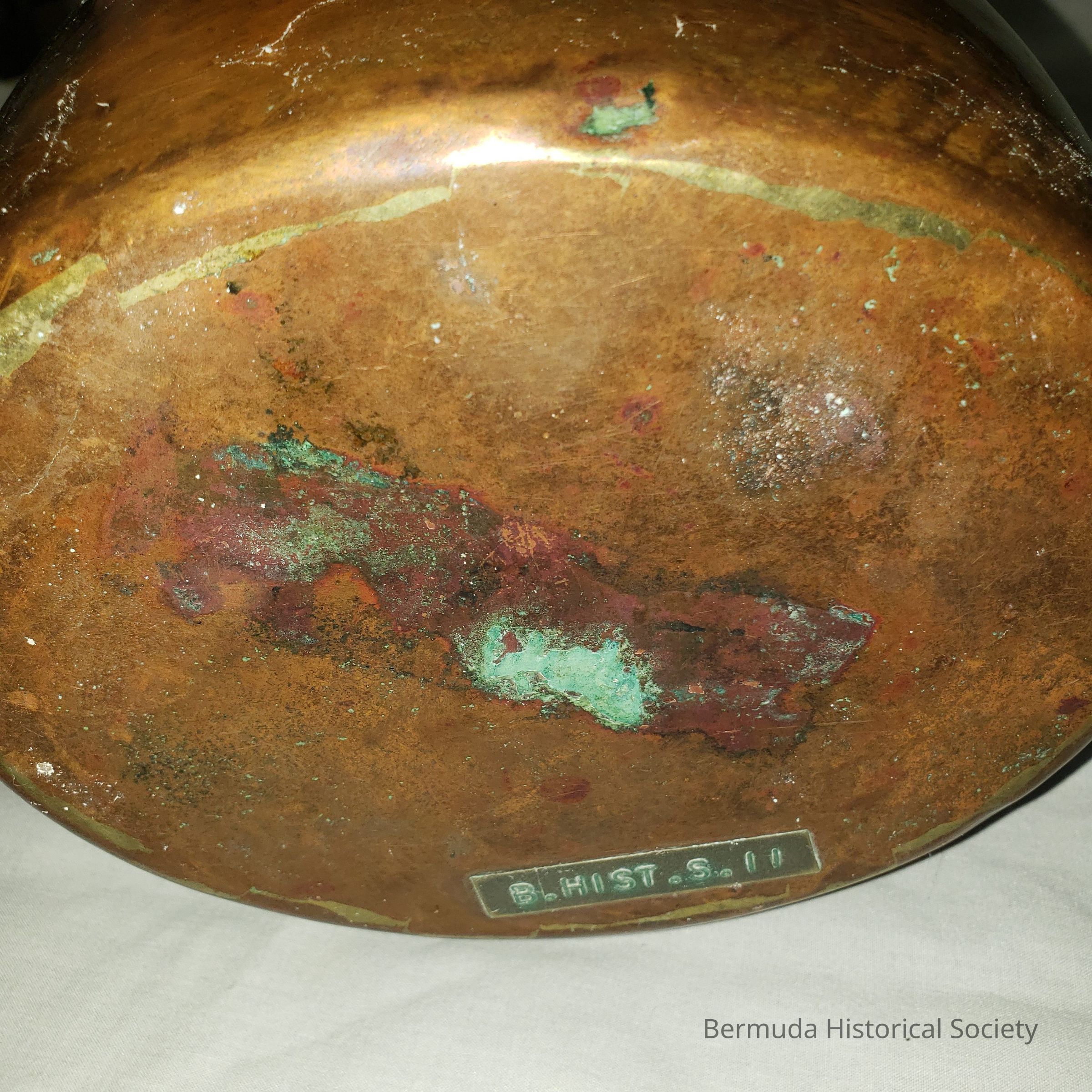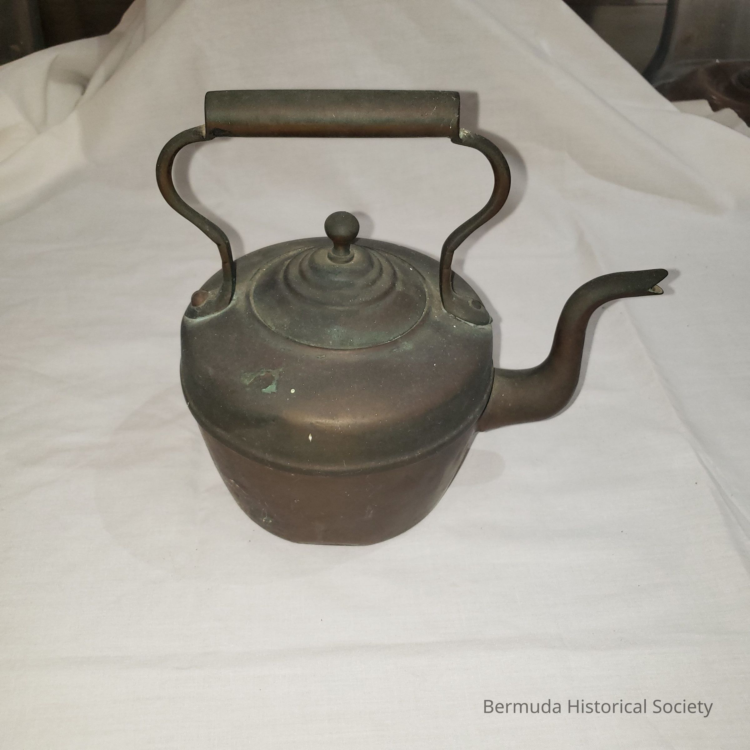 Kettle. Copper. B. Hist. S. 11. With removable lid and fixed (non-moving) handle. Located near fireplace in Living Room.