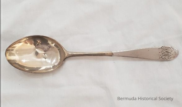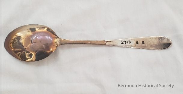 1 serving spoon, 27.13. M#263. Donated by the late Major Ian C. Morgan. MB on handle
