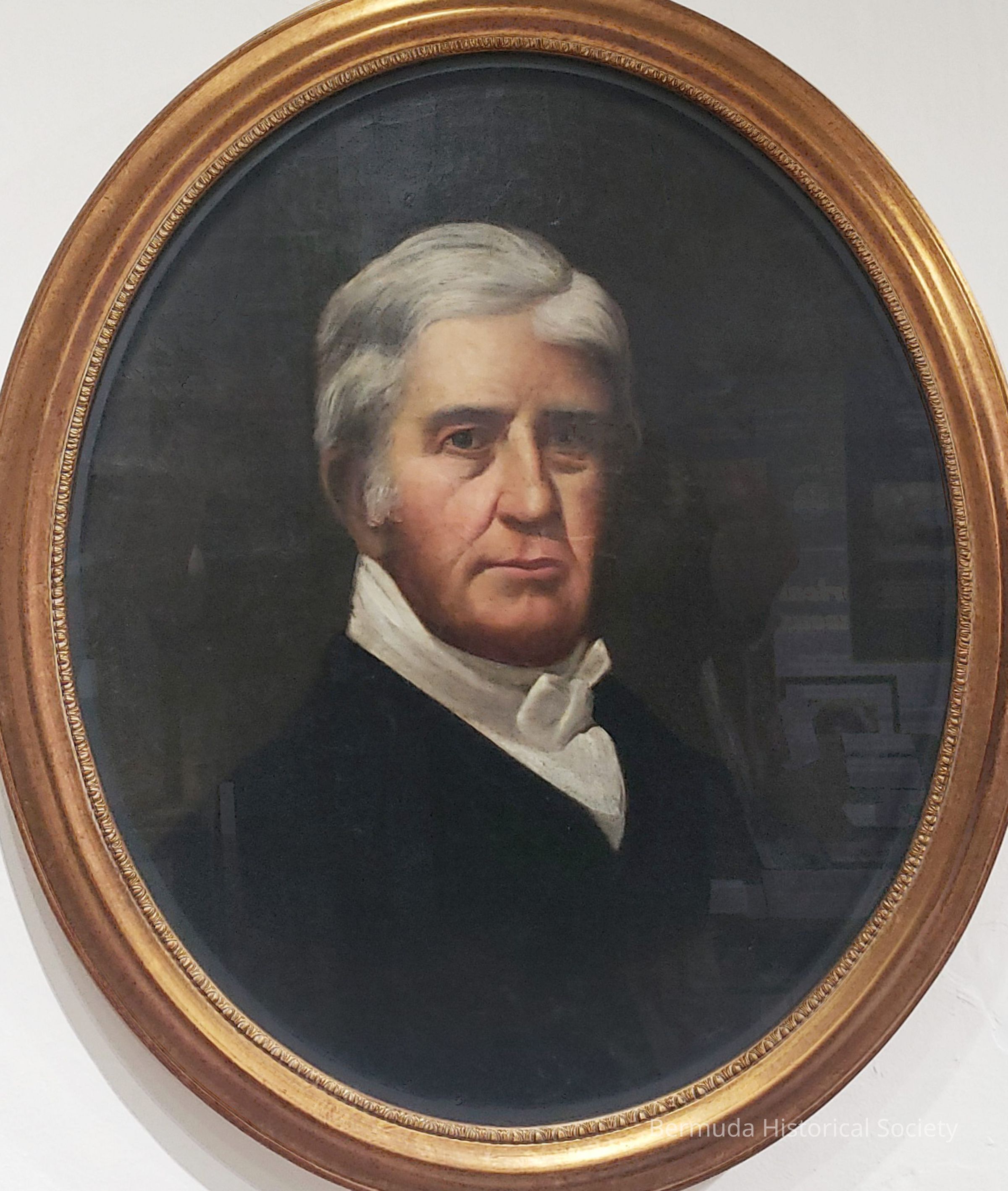 20:15 William Bennett Perot, Esq. Oil painting, 23.65 x 19.75, by an unknown artist, in ornate gilded frame size 31 x 27. William Perot was born in 1790. Although his main claim to historical fame is because of his appointment as the first Postmaster General of Hamilton - and issuer of the famous, unique and now very rare philatelic Perot Stamp - he was also a Colonel of the local Militia and a distinguished member of the House of Assembly for many years. He died in 1871.