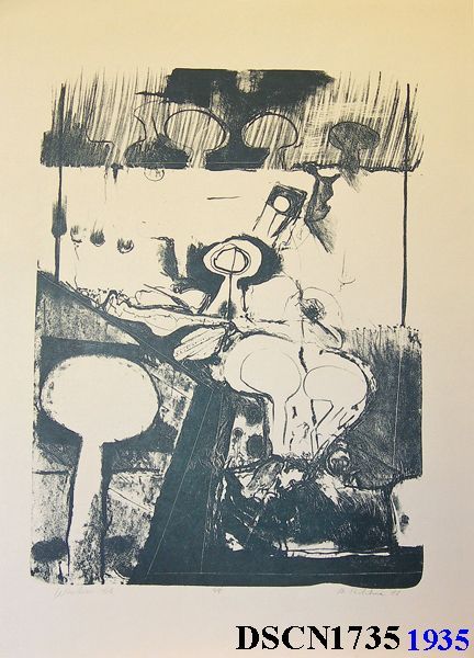 Lithograph. Black and white. Image 16" x 12" on 22" x 15" buff Basingwerk Parchment paper. Signed lower right.Made/Created