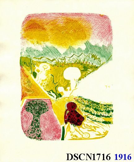 Lithograph. Yellow, green, red and black. Image 8" x 5 1/2" on 10" x 8" Rives BFK paper.Made/Created