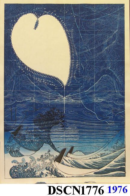 Artist's iconic images of heart-like forms called Loci (plural of Locus), the famous Hokusai print known as the "Great Wave" stylized, a map background derived from an area known as the "Crossing of the Fathers," on the Colorado River, now under Lake Powell, Arizona, filming site of the spaceship crash scene in Planet of the Apes. One of 141 impressions.Type of Print