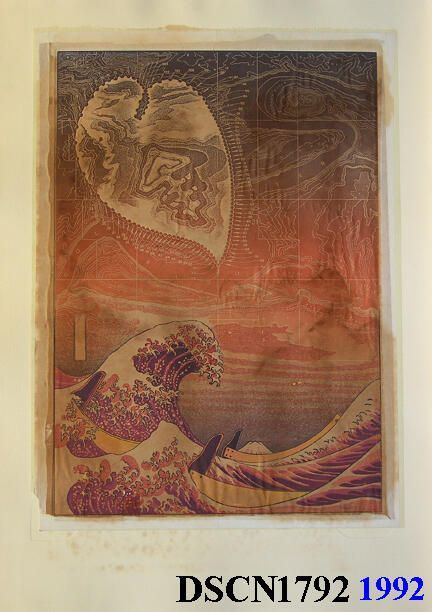 Artist's iconic images of heart-like forms called Loci (plural of Locus), the famous Hokusai print known as the "Great Wave" stylized, a map background derived from an area known as the "Crossing of the Fathers," on the Colorado River, now under Lake Powell, Arizona, filming site of the spaceship crash scene in Planet of the Apes. One of 141 impressions.Type of Print