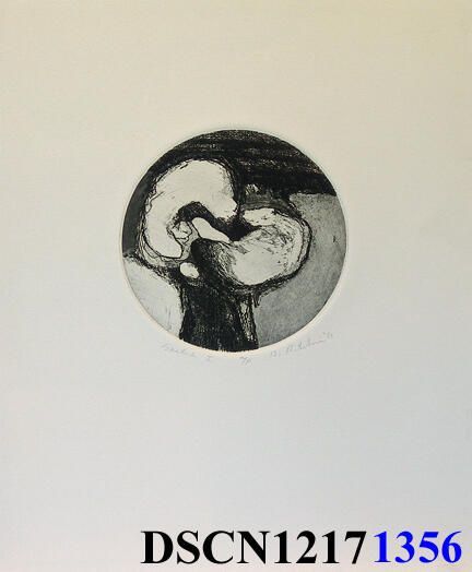 Intaglio. Black and white. Image 4 3/8" circumference on 11 1/2" x 9 3/4" Rives BFK paper. Signed lower right.Made/Created