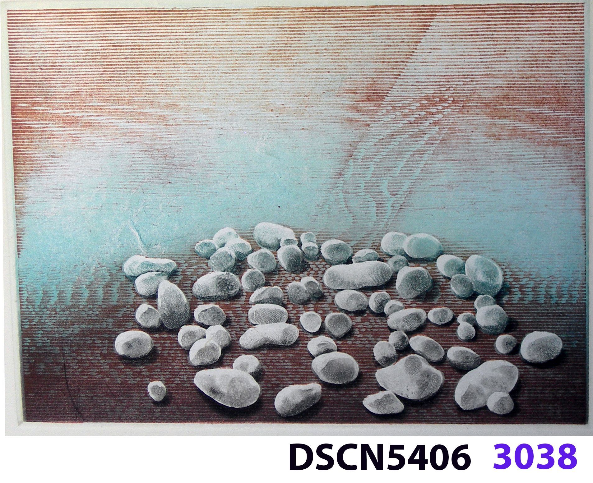 Stone Set IV: As a historical note, artist Bill Ritchie worked briefly at the Munch Museum studying the wood blocks that Edvard Munch cut and printed. Some of his woodcuts, notably "Badende Mann," (Bathing Man) he printed not as replicas or multiples all alike, but with different colors. These are termed monoprints, which means there are blocks which and be used to make almost identical impressions, but for artistic purposes (i.e., enjoyment of the creative artist) but the artist chose instead to make variations. In this print, Stone Set, Bill used an etched zinc plate from the Stone Set series and an under-image to a carved woodblock. Most, if not all, of the etched plates were printed in black, but the woodblock, being that it is printed with water-based colors in the Japanese manner (sosaku hanga) invites spontaneous color changes. The printer only has to dip the brush into a different color on the palette to produce a change. In other, mostly oil-based printing mediums, color changes are not that easy. Munch, for example, had to clean his inking slab and roller each time he wanted to try a different color. It must be mentioned, also, that Bill carved the lines in wood based on his video art. Television in those days was analog technology, with one or three electron beams scanning side-to-side of the picture from top to bottom and back again. The "picture" in Bill's video for this woodcut was not of the the real world, but the lines were instead the result of his stopping a videotape on a reel-to-reel videotape player and freezing the scanning at that stop-point. He photographed the TV screen, printed the negatiive, an traced it line-by line onto the woodcut and started carving. Another element to be mentioned is that the woodcut was printed on thin Asian paper (which works best in Japanese woodcut-style printing), let dry, then laminated to the etching in a second printing. The method is called Chine-colle, with water-based paste used to glue the sheets togehter. On close examination, one can tell the black oil-based etching ink is printed over the color, water-based ink.