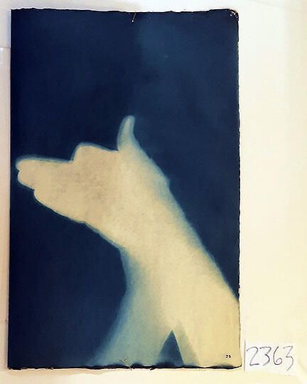 Handmade Dog Cyanotype No. 25 of 32: Norman Durkee, a Seattle composer, was a friend of mine and he sent me a tape of works made on his new Buchla synthesizer. One was titled, "Handmade Dog," a silly, rambling ditty with his synthesized "Woof woof" interspersed. My thought was to collaborate with Norman with my own handmade dogs. I had been doing such hand-shadow prints for some time. The technique, cyanotype, is sometimes called "sun printmaking" because sunlight is ideal, especially in months when the sun is high and rich in UV. The method requires coating paper with chemicals, letting it dry in a dark place, and then - in the sun as I did in this series - laying the paper out flat and putting like one's hand on it. Where the sun strikes the chemical, a reaction occurs and after some seconds or a minute, the paper is shielded until it can be washed. In cold, running water, the unexposed chemicals dissolve and wash away. Where the sun struck, the chemicals became insoluble and turn blue. Invented at the time many photo processes were (the mid-19th Century), it never achieved commercial value except in making blueprints and fine art photographs. To make the series of 32 prints I made a cyanotype or two a day in the summer of 1982, climbing to the rooftop hatch to the top of the Journal of Commerce Building in Seattle, which was home to the Triangle Studios for me from 1977-1983. See my memoir, "Dumb Hope: My curious life - 1981-1990."
