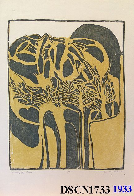Relief. Ochre and Black and white. Image 11" x 8 1/2" on 14 3/4" x 10" white Japanese paper. Signed lower right.Made/Created