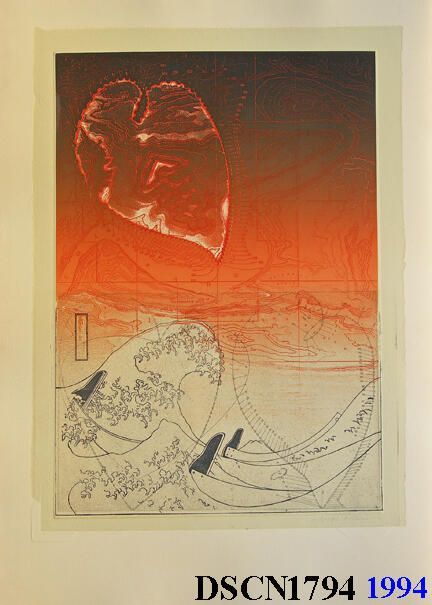 Artist's iconic images of heart-like forms called Loci (plural of Locus), the famous Hokusai print known as the "Great Wave" stylized, a map background derived from an area known as the "Crossing of the Fathers," on the Colorado River, now under Lake Powell, Arizona, filming site of the spaceship crash scene in Planet of the Apes. One of 141 impressions.Type of Print