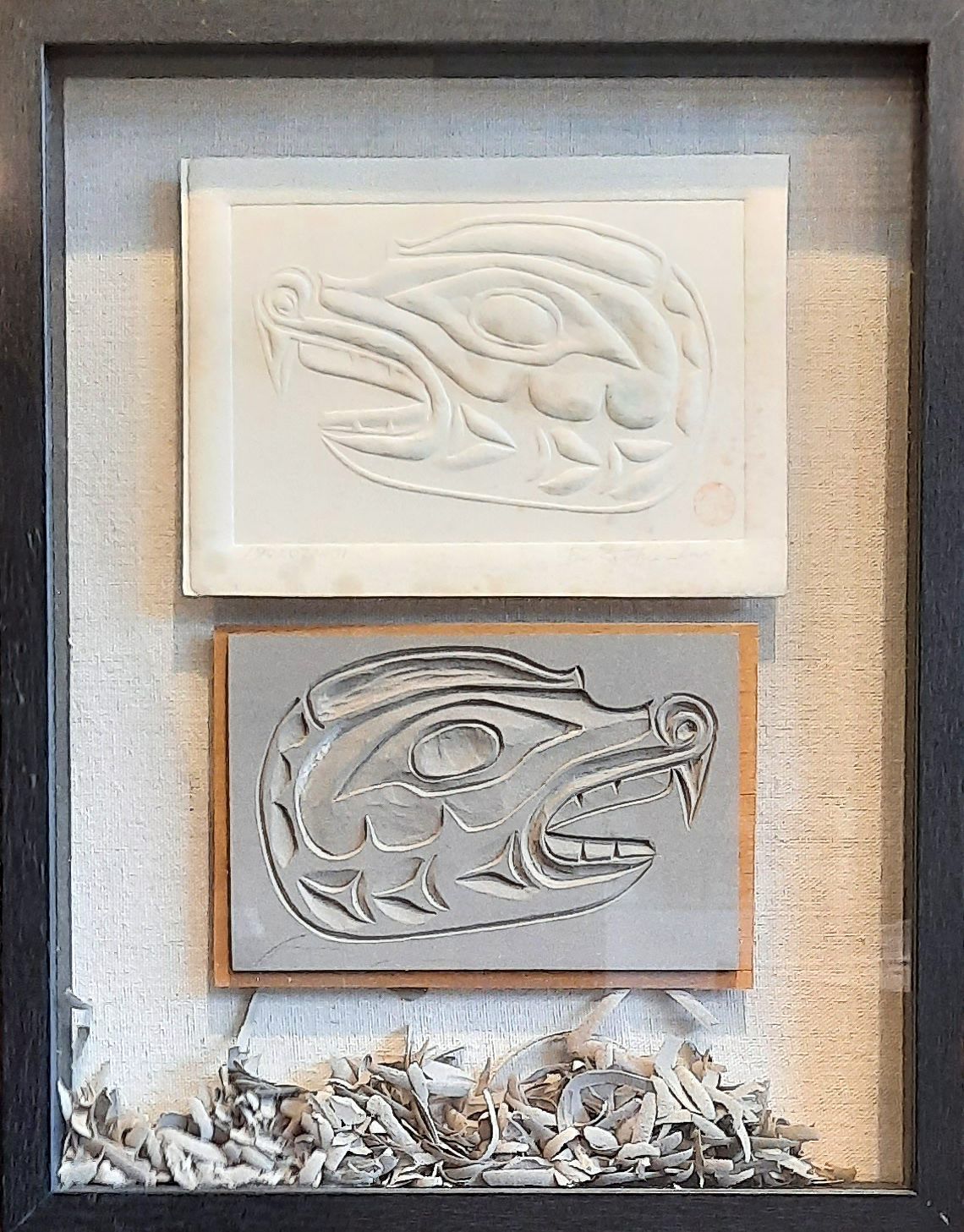 Shadow box frame with a lino block, it's embossed image, and shavings on the bottom. Design by Ed Raub.Other Names and Numbers