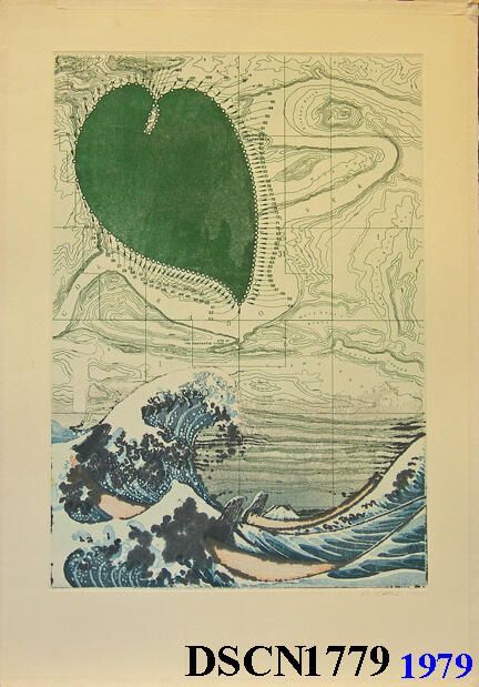 Artist's iconic images of heart-like forms called Loci (plural of Locus), the famous Hokusai print known as the "Great Wave" stylized, a map background derived from an area known as the "Crossing of the Fathers," on the Colorado River, now under Lake Powell, Arizona, filming site of the spaceship crash scene in Planet of the Apes. One of 141 impressions.Type of Print