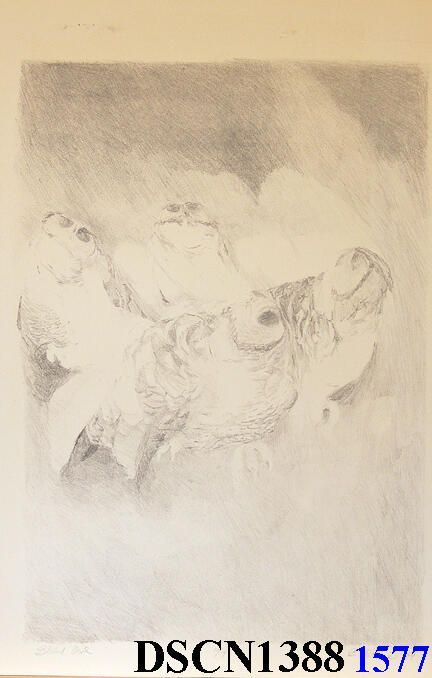 Lithograph. Black and white. Image 14 1/2" x 10" on 17" x 11" Hot Press Cover Basingwerk Parchment paper. Signed lower right.Type of Print