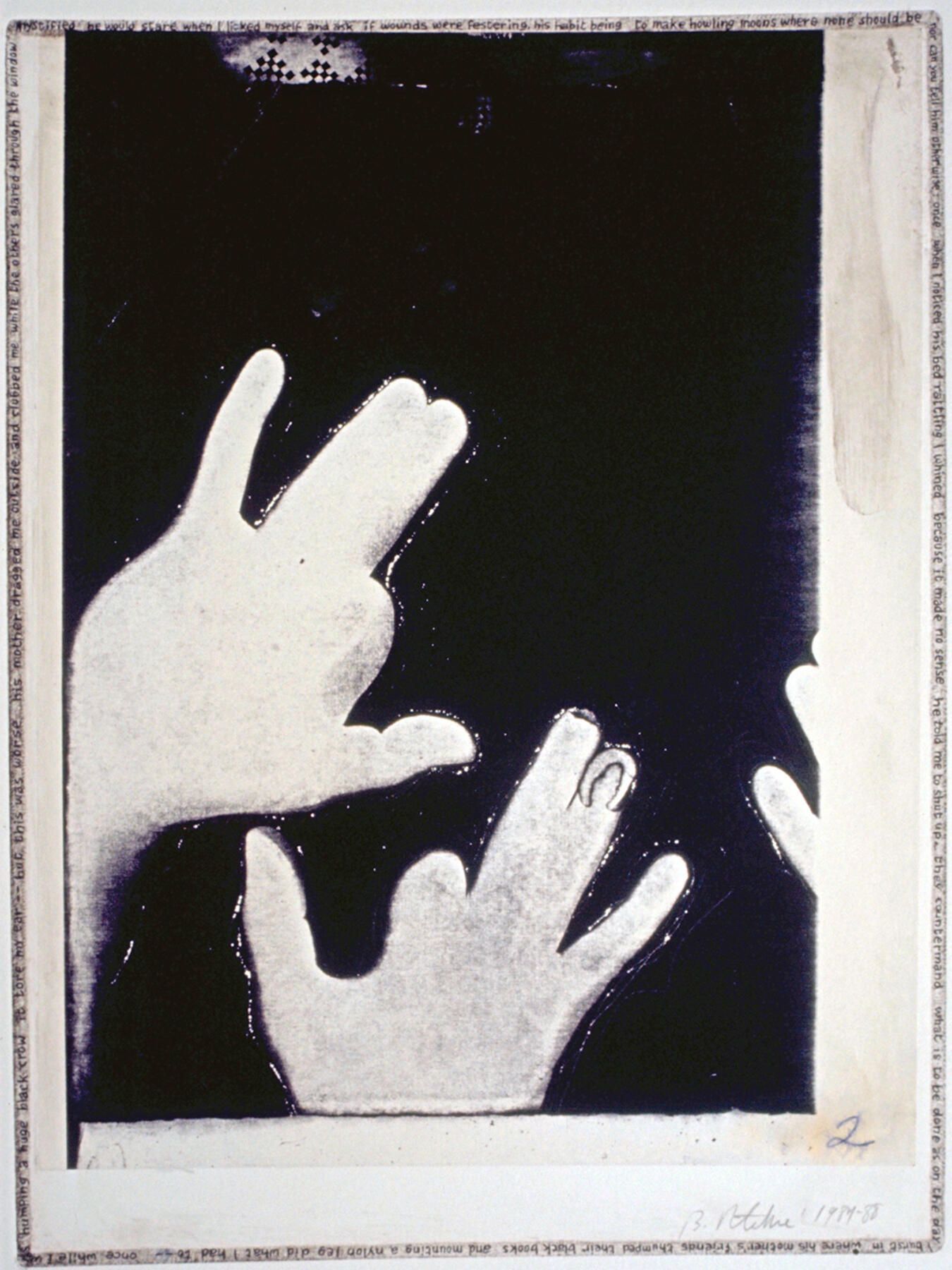 A hand-shadow dog originated in cyanotype, which was scanned and printed by an office copier, then laminated by chine-colle to etching paper on a copper plate whose edges were beveled and polished. With a fine pen point, Worley's poem was written around the perimeter of the embossing, with added tiny checkerboard patterns. Also, bones were painted with a fingertip and black etching ink.