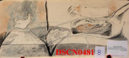 Pencil, colored pencil, wash and spatter. Black, gray, orange and blue. Image 11" x 25" on 11 1/2" x 25 1/2" white Tuscan (sulphite) paper. Signed lower right.Artwork Details