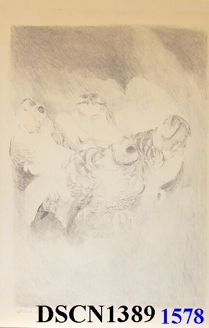 Lithograph. Black and white. Image 14 1/2" x 10" on 17" x 11" Hot Press Cover Basingwerk Parchment paper. Signed lower right.Type of Print
