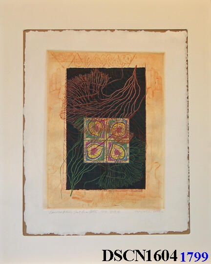 Intaglio and chine colle. Multiple colors. Image 12" x 9" on 15" x 12" (possibly Copperplate Deluxe) paper. Signed lower right.Artwork Details
