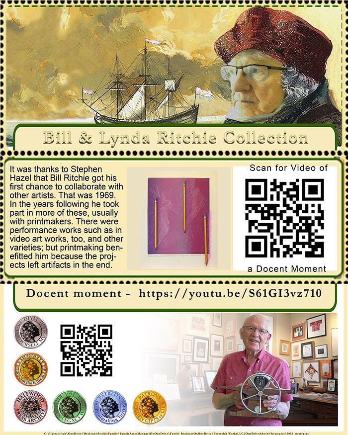 Printmaking may be the first art form to be collaborative, a social art form. In the scenario of two prehistoric people working in a cavern, their handiwork in progress on the wall of the cave, one is painting, the other uses her hand as a stencil, blowing a spattering of paiint over it it to leave her mark. Who made the paint? Maybe it was the painter, but it raises the question of the need for other people. There is an audience, too, who will watch the works in progress, maybe, or who will come along thirty-thousand years later. As a printmaker, painters were my teachers and printmaking was a cousin to painting (and usually a poor cousin). What my teachers did not know (because they were college-taught, subsidized artists) was that collaboration got the artists where they are. It was printers who spread the word. Sometimes it was the painter, like Rembrandt, who made his own prints. The thread of collaboration in my life became evident with Stephen Hazel's initiation of projects like the "Bill Ritchie Memorial Hanga Workshop" in the early 1970's, and formation of Multicom. Community was his goal. It was not painters and sculptors who touted community development, communication, sharing information, and collaboration for the sake of education and mutual benefits. It is printmaking. Print is the ancestor of all science, technology, reading and writing, engineering, the arts, mathematics and its cousin, music. Collaboration is the word; one might as well say, "In the beginning there was print."