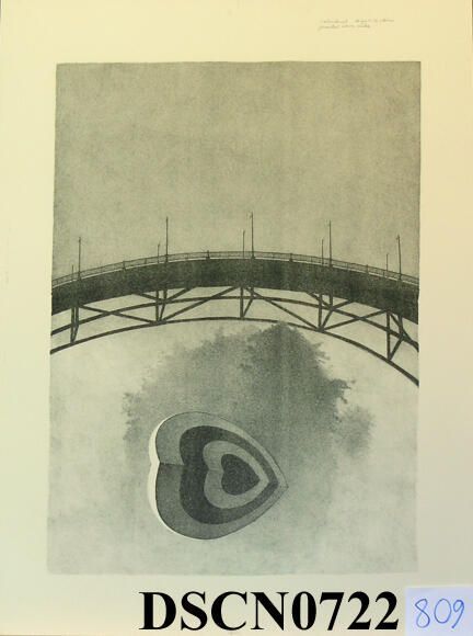 Trial proof in the Target Heart 2 edition. The crayon manner drawing on stone is slow and exacting in the way that I approached the method, and a good way to meditate on my themes. I was combining the target heart, trees, reflections, and bridge themes into the composition. This was when trees were moving back to the background, the bridge an over-arching character and the target hearts to the foreground.