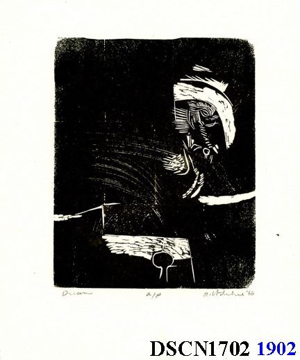 I dreamed I found his house empty, and went into the attic to help finish his partly-finished home. But I jostled some wires and caused them to short circuit. The sparks lighted the insulation, and I set the house afire. There was no time to get water, so I pee'd on the fire. This dream recurred even 'til the year 2000, with variations. This was my first -- and last -- wood engraving; I made the block myself.