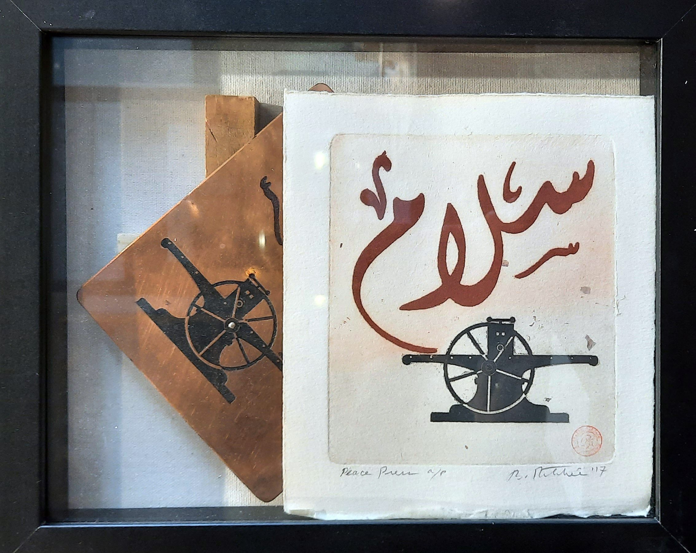 Shadow box frame with Peace Press print and it's copper plate.Made/Created