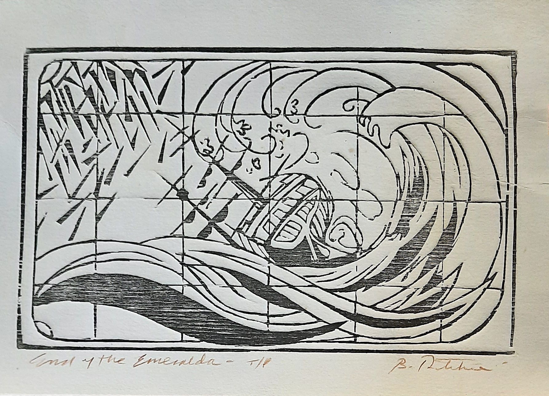 Black and white print of the Emeralda ship succumbing to great waves.Type of Print
