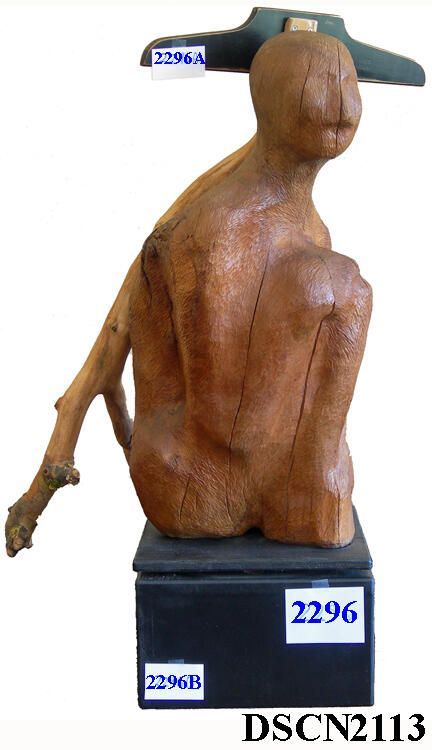 Wood sculpture of a person sitting with their knees to their chest. A tree-branch T-square at the top. The two have been separated since this photo was made.Type of Sculpture