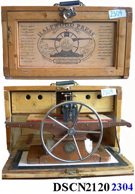 Wooden box that holds a Mini Halfwood Press. "Halfwood Press" stamped on outside. Side opens with two drawers and a glass ink-mixing pallet on lid.Use