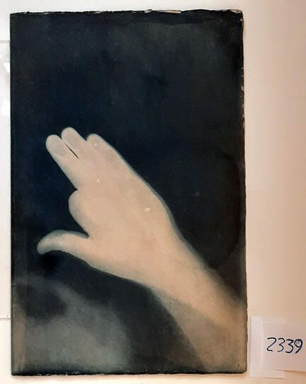 Norman Durkee, a Seattle composer, was a friend of mine and he sent me a tape of works made on his new Buchla synthesizer. One was titled, "Handmade Dog," a silly, rambling ditty with his synthesized "Woof woof" interspersed. My thought was to collaborate with Norman with my own handmade dogs. I had been doing such hand-shadow prints for some time. The technique, cyanotype, is sometimes called "sun printmaking" because sunlight is ideal, especially in months when the sun is high and rich in UV. The method requires coating paper with chemicals, letting it dry in a dark place, and then - in the sun as I did in this series - laying the paper out flat and putting like one's hand on it. Where the sun strikes the chemical, a reaction occurs and after some seconds or a minute, the paper is shielded until it can be washed. In cold, running water, the unexposed chemicals dissolve and wash away. Where the sun struck, the chemicals became insoluble and turn blue. Invented at the time many photo processes were (the mid-19th Century), it never achieved commercial value except in making blueprints and fine art photographs. To make the series of 32 prints I made a cyanotype or two a day in the summer of 1982, climbing to the rooftop hatch to the top of the Journal of Commerce Building in Seattle, which was home to the Triangle Studios for me from 1977-1983. See my memoir, "Dumb Hope: My curious life - 1981-1990."