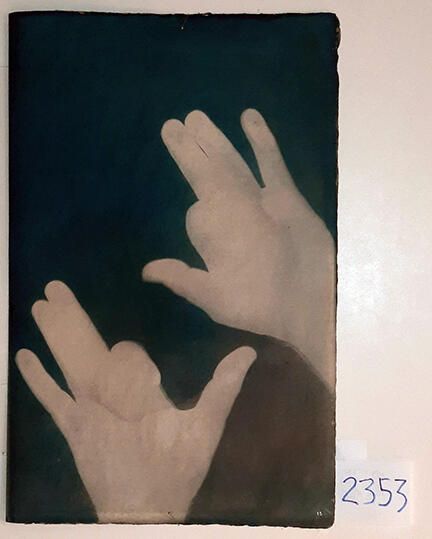 Norman Durkee, a Seattle composer, was a friend of mine and he sent me a tape of works made on his new Buchla synthesizer. One was titled, "Handmade Dog," a silly, rambling ditty with his synthesized "Woof woof" interspersed. My thought was to collaborate with Norman with my own handmade dogs. I had been doing such hand-shadow prints for some time. The technique, cyanotype, is sometimes called "sun printmaking" because sunlight is ideal, especially in months when the sun is high and rich in UV. The method requires coating paper with chemicals, letting it dry in a dark place, and then - in the sun as I did in this series - laying the paper out flat and putting like one's hand on it. Where the sun strikes the chemical, a reaction occurs and after some seconds or a minute, the paper is shielded until it can be washed. In cold, running water, the unexposed chemicals dissolve and wash away. Where the sun struck, the chemicals became insoluble and turn blue. Invented at the time many photo processes were (the mid-19th Century), it never achieved commercial value except in making blueprints and fine art photographs. To make the series of 32 prints I made a cyanotype or two a day in the summer of 1982, climbing to the rooftop hatch to the top of the Journal of Commerce Building in Seattle, which was home to the Triangle Studios for me from 1977-1983. See my memoir, "Dumb Hope: My curious life - 1981-1990."