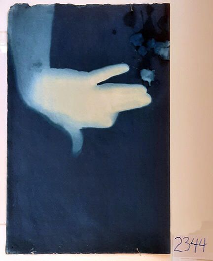Norman Durkee, a Seattle composer, was a friend of mine and he sent me a tape of works made on his new Buchla synthesizer. One was titled, "Handmade Dog," a silly, rambling ditty with his synthesized "Woof woof" interspersed. My thought was to collaborate with Norman with my own handmade dogs. I had been doing such hand-shadow prints for some time. The technique, cyanotype, is sometimes called "sun printmaking" because sunlight is ideal, especially in months when the sun is high and rich in UV. The method requires coating paper with chemicals, letting it dry in a dark place, and then - in the sun as I did in this series - laying the paper out flat and putting like one's hand on it. Where the sun strikes the chemical, a reaction occurs and after some seconds or a minute, the paper is shielded until it can be washed. In cold, running water, the unexposed chemicals dissolve and wash away. Where the sun struck, the chemicals became insoluble and turn blue. Invented at the time many photo processes were (the mid-19th Century), it never achieved commercial value except in making blueprints and fine art photographs. To make the series of 32 prints I made a cyanotype or two a day in the summer of 1982, climbing to the rooftop hatch to the top of the Journal of Commerce Building in Seattle, which was home to the Triangle Studios for me from 1977-1983. See my memoir, "Dumb Hope: My curious life - 1981-1990."