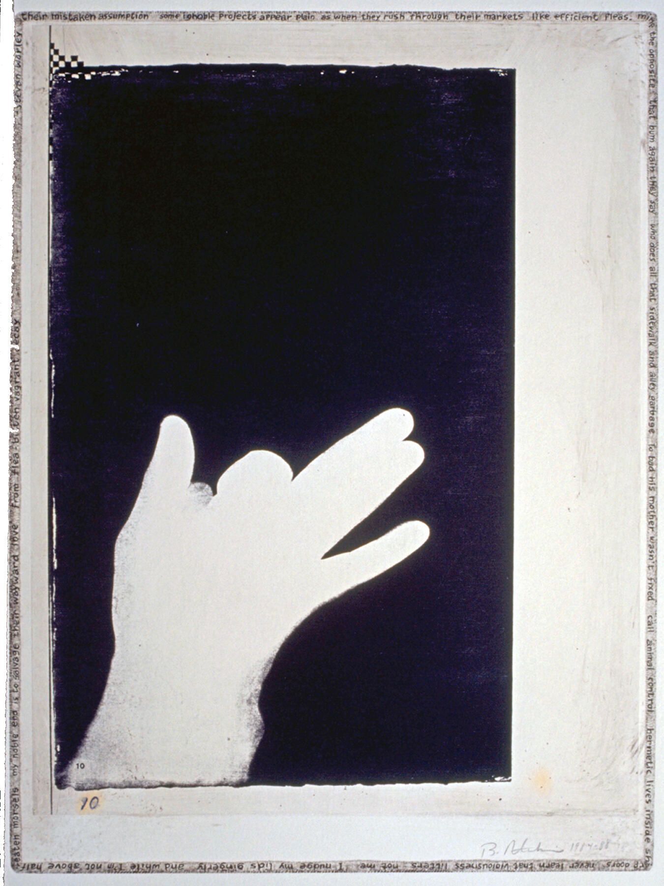 A hand-shadow dog originated in cyanotype, which was scanned and printed by an office copier, then laminated by chine-colle to etching paper on a copper plate whose edges were beveled and polished. With a fine pen point, Worley's poem was written around the perimeter of the embossing, with added tiny checkerboard patterns. Also, bones were painted with a fingertip and black etching ink.