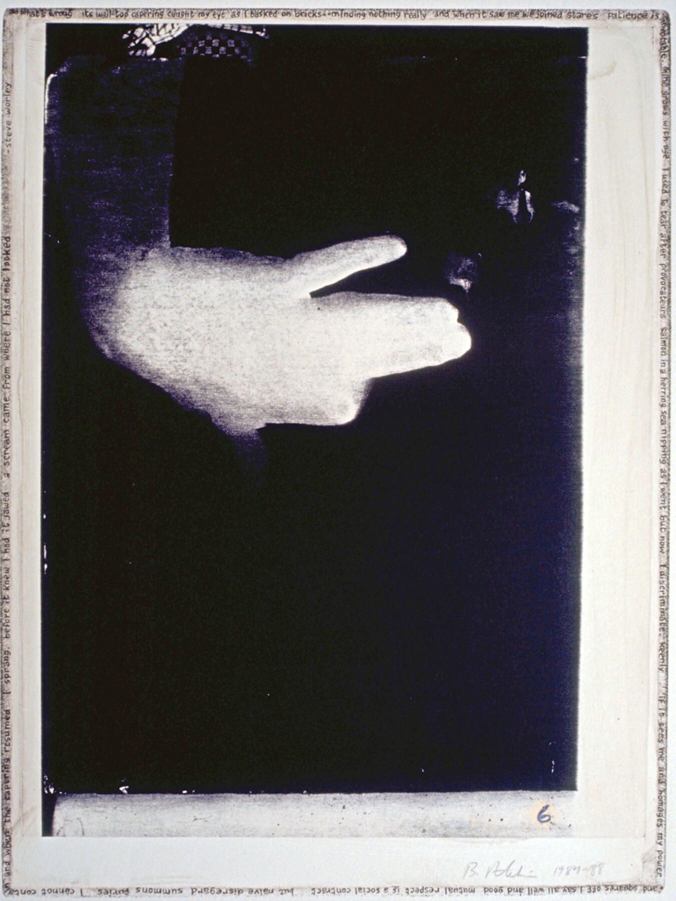A hand-shadow dog originated in cyanotype, which was scanned and printed by an office copier, then laminated by chine-colle to etching paper on a copper plate whose edges were beveled and polished. With a fine pen point, Worley's poem was written around the perimeter of the embossing, with added tiny checkerboard patterns. Also, bones were painted with a fingertip and black etching ink.