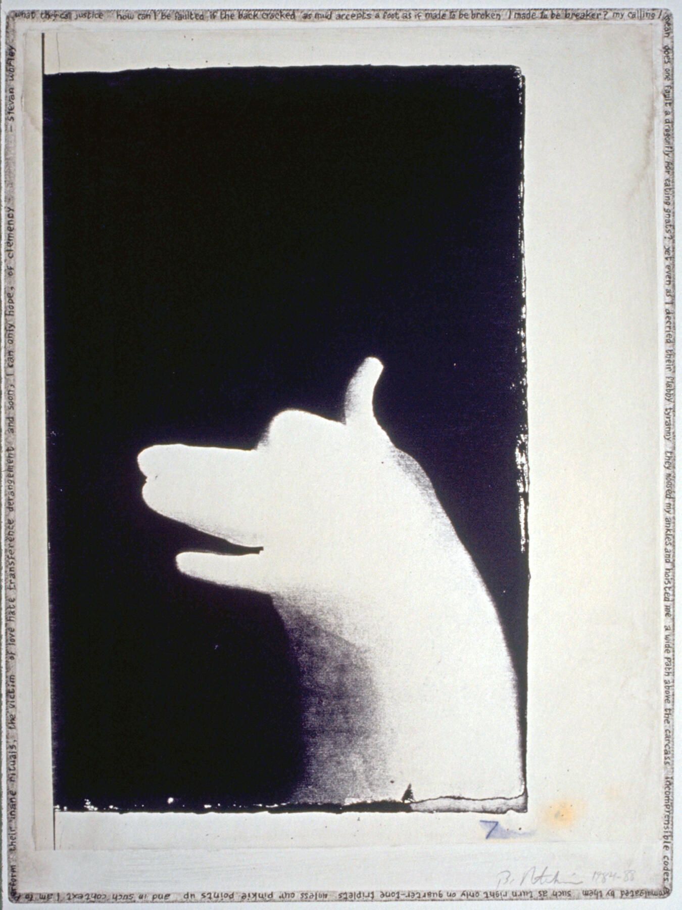 A hand-shadow dog originated in cyanotype, which was scanned and printed by an office copier, then laminated by chine-colle to etching paper on a copper plate whose edges were beveled and polished. With a fine pen point, Worley's poem was written around the perimeter of the embossing, with added tiny checkerboard patterns. Also, bones were painted with a fingertip and black etching ink.