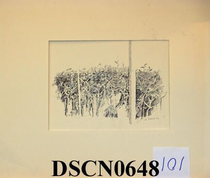 Pen and graphite. Blue-gray and gray. Image 7" x 8 1/2" on 7 1/2" x 13 1/2" Basingwerk Parchment paper. Signed lower right.Made/Created
