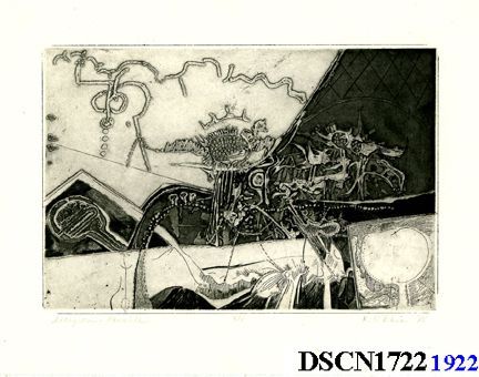 Intaglio and lithograph. Black and white. 5" x 7 1/2" on 7 1/2" x 9 3/4" Rives BFK paper. Signed lower right.Artwork Details