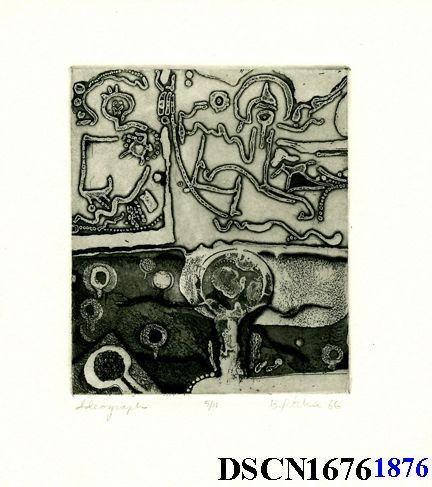 Intaglio. Black and white. Image 6" x 4" on 7 1/2" x 7" Rives BFK paper. Signed lower right.Made/Created