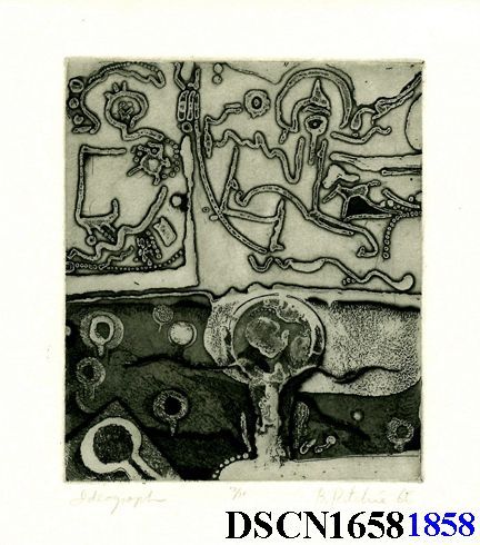 Intaglio. Black and white. Image 6" x 4" on 7 1/2" x 7" Rives BFK paper. Signed lower right.Made/Created
