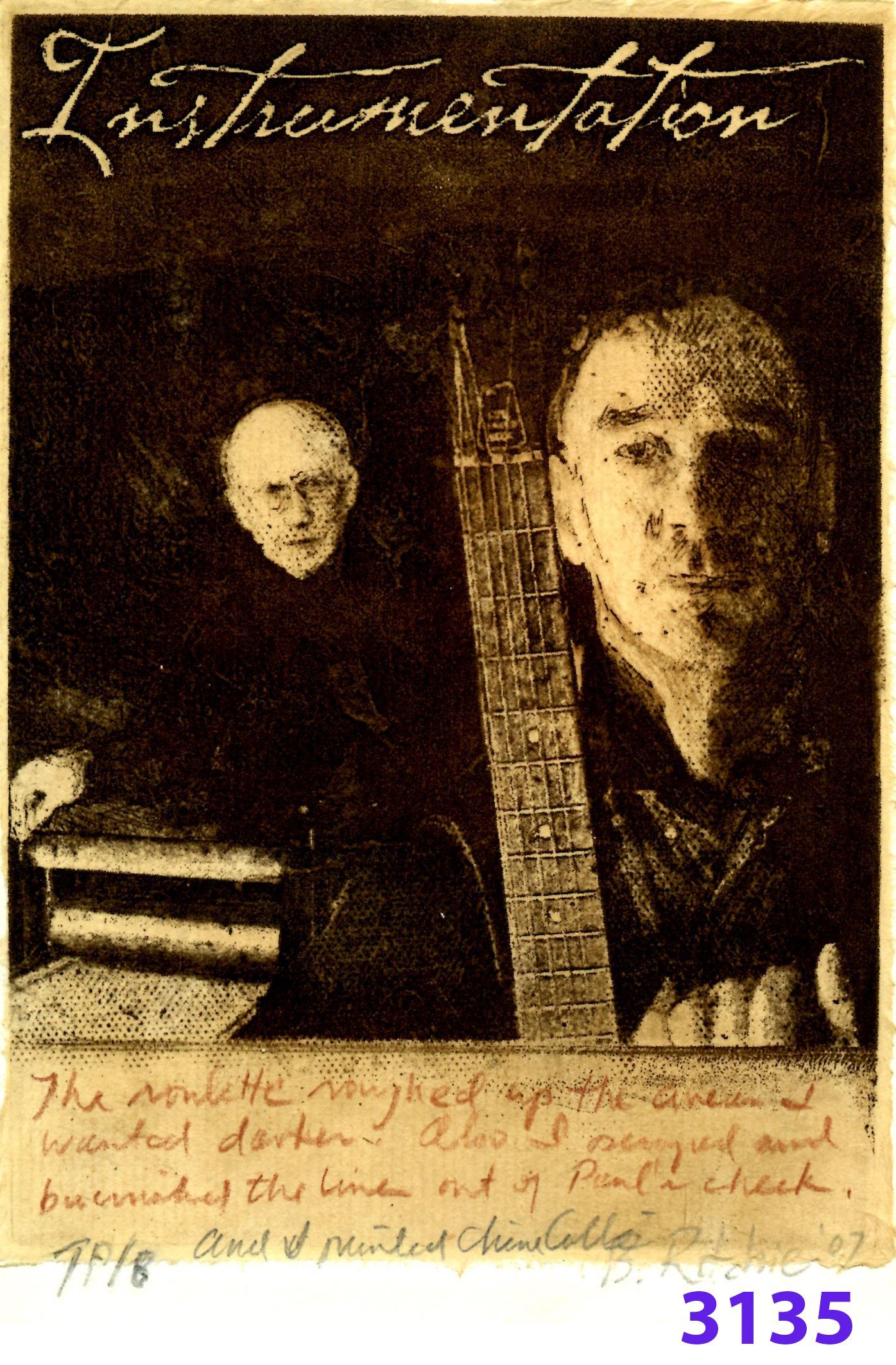 Intaglio. Dark brown on chinecolle intaglio on Japanese Kitakata. Colored pencil and graphic handwritten noteations on bottom. Signed Lower Right.Type of Print