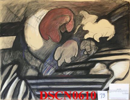 Conte, colored pencil. Brown, black, red, blue, white on buff paper. Image bleeds to edges of 20 X 16 in. charcoal paper. Signed near center, right edge.Artwork Details