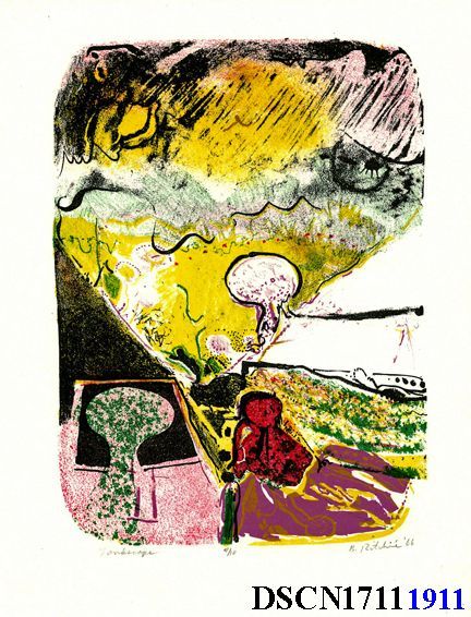 Lithograph. Yellow, green, red, purple and black. Image 8" x 5 1/2" on 10" x 8" Rives BFK paper. Signed lower right.Made/Created