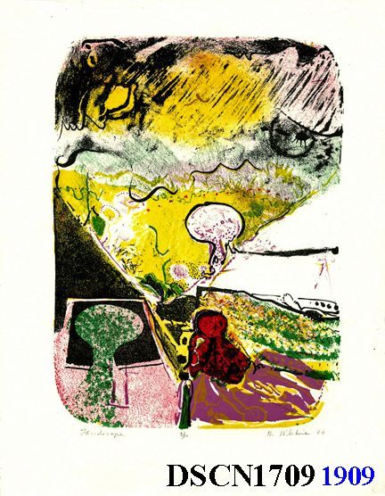 Lithograph. Yellow, green, red, purple and black. Image 8" x 5 1/2" on 10" x 8" Rives BFK paper. Signed lower right.Made/Created