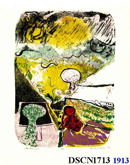 Lithograph. Yellow, green, red, purple and black. Image 8" x 5 1/2" on 10" x 8" Rives BFK paper. Signed lower right.Made/Created