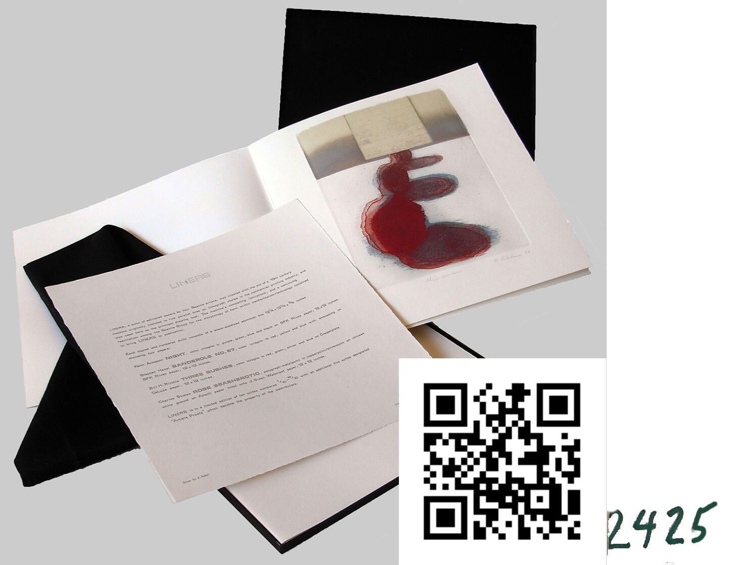 The suite is contained in a 12 X 12 in. black, anodized aluminum case made by Kathleen Rabel, which is inside a linen slip case made by Ms. Rabel's mother. The black box is shown open, the slipcase folded underneath, and the colophon page on top. Bill Ritchie's contribution is shown, too, but the works by the other three artists is not shown here. The QR code linked to a a short video by Bill Ritchie, made in 2020, the URL is https://youtu.be/AfbgoeM2qZI